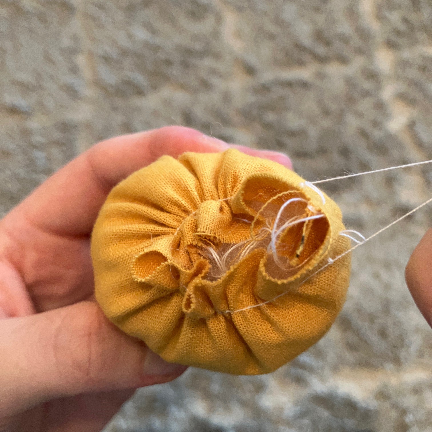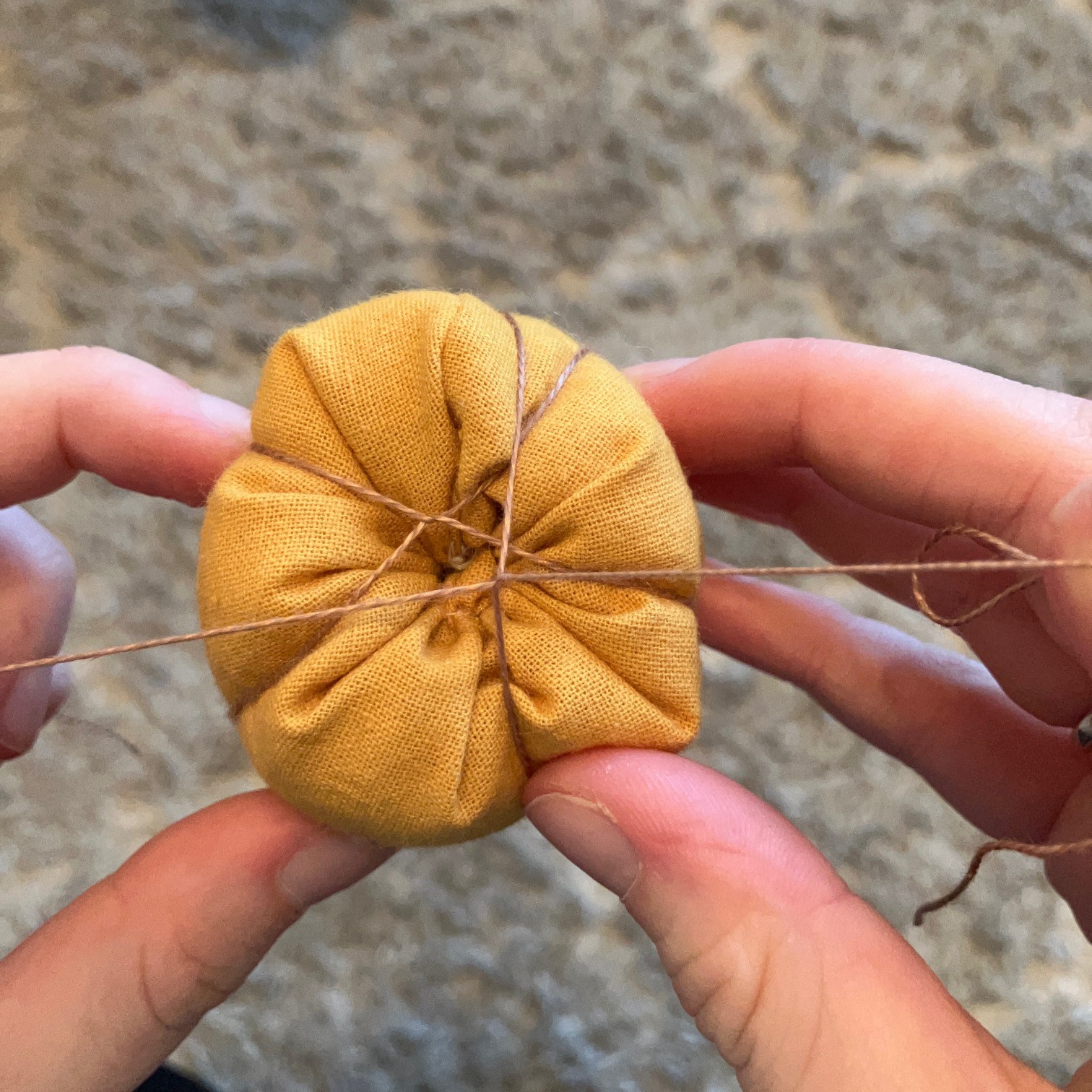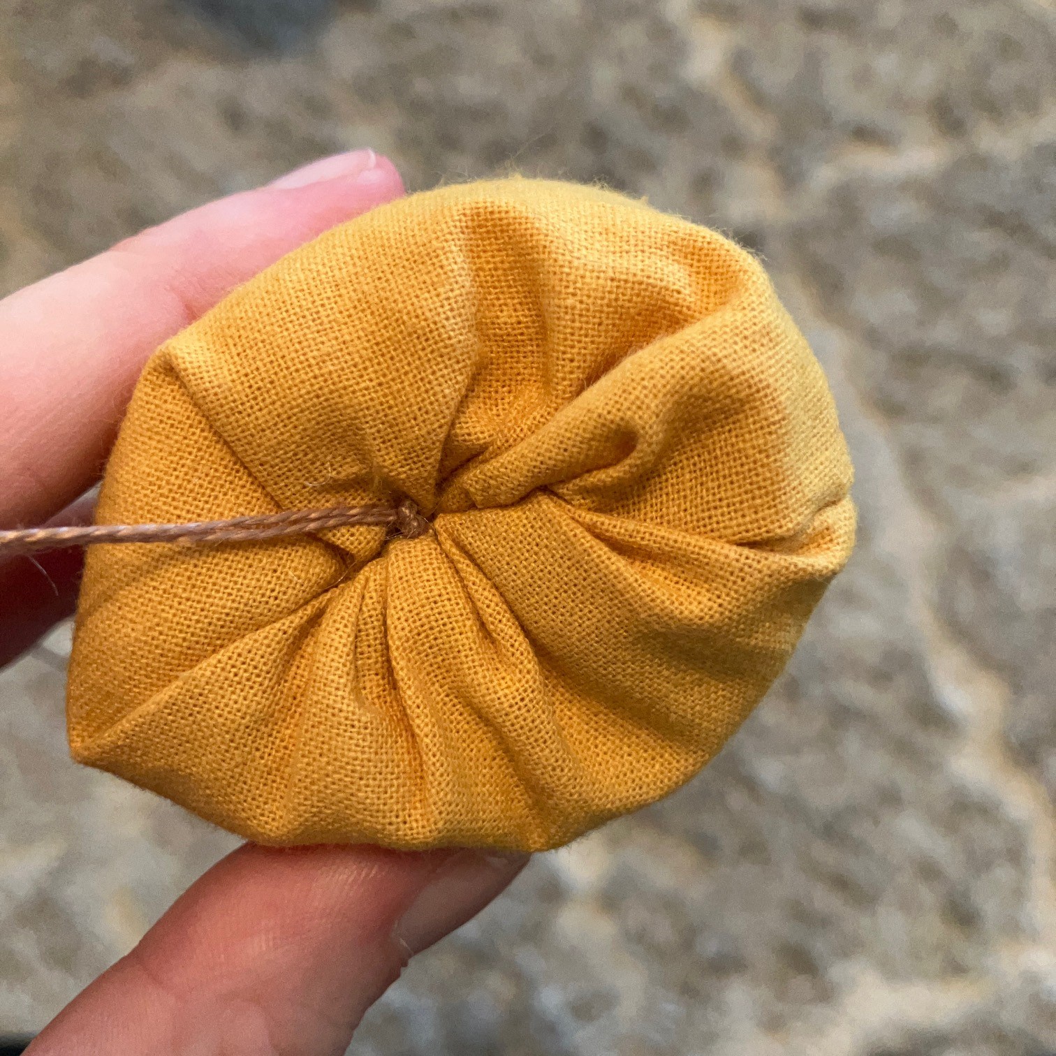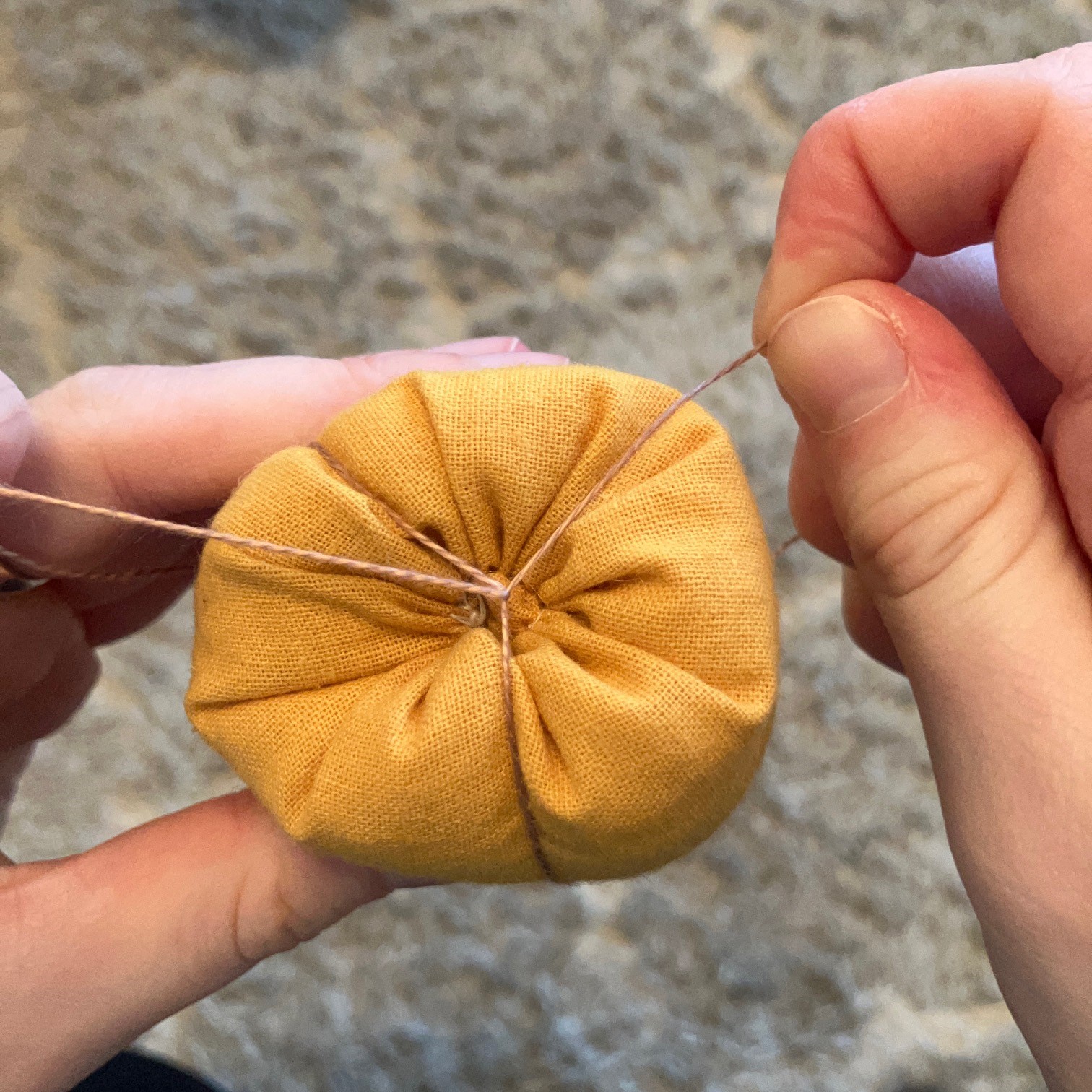 Pull the gathering stitches at the top of the pumpkin. Once gathered, knot the remaining threads to secure and cut close to knot. This will later be disguised by the stalk.