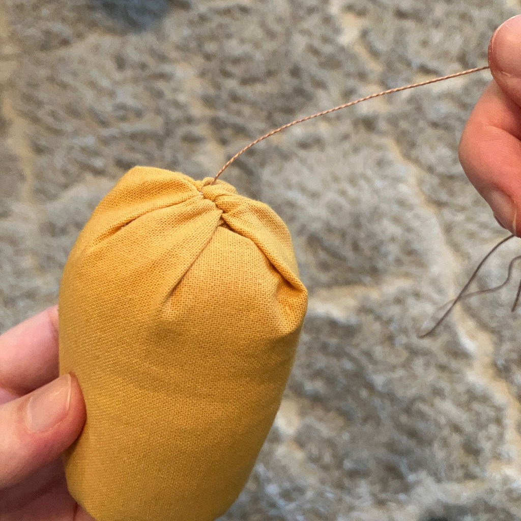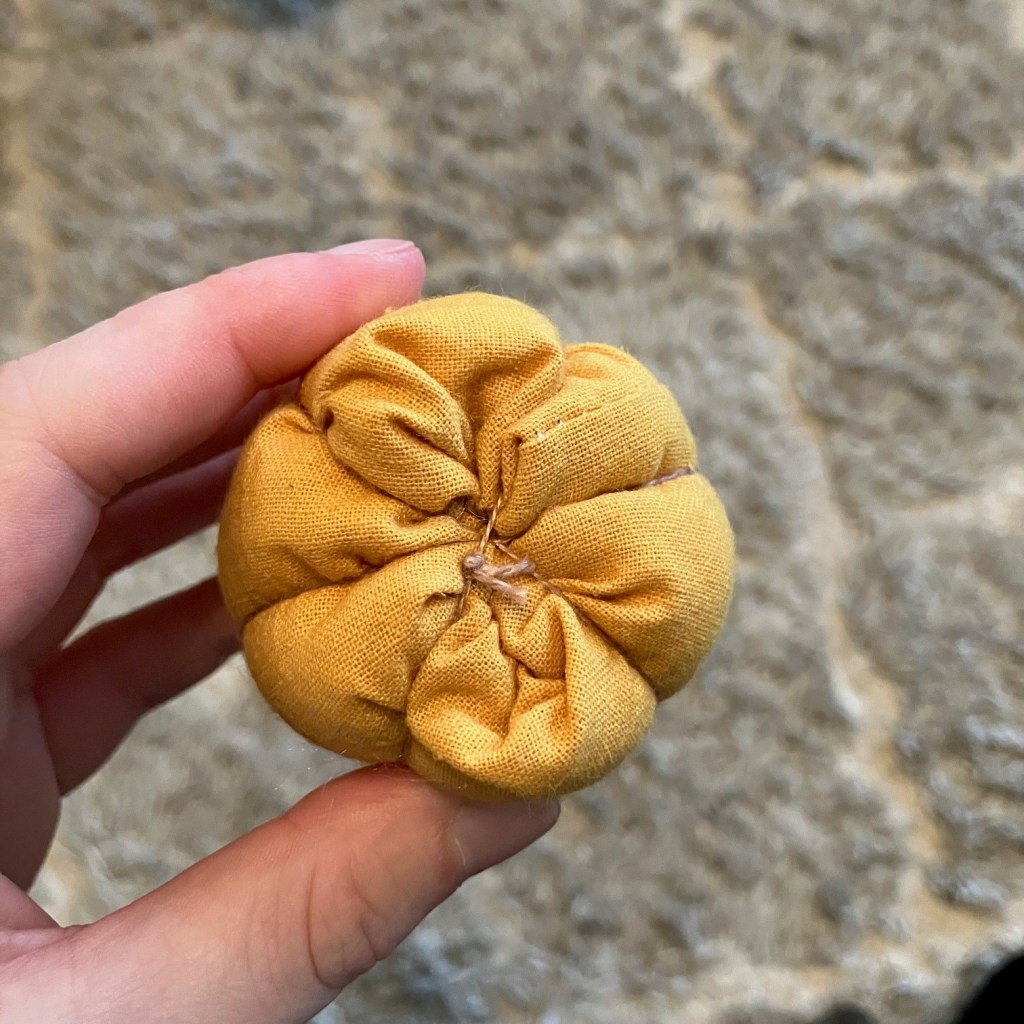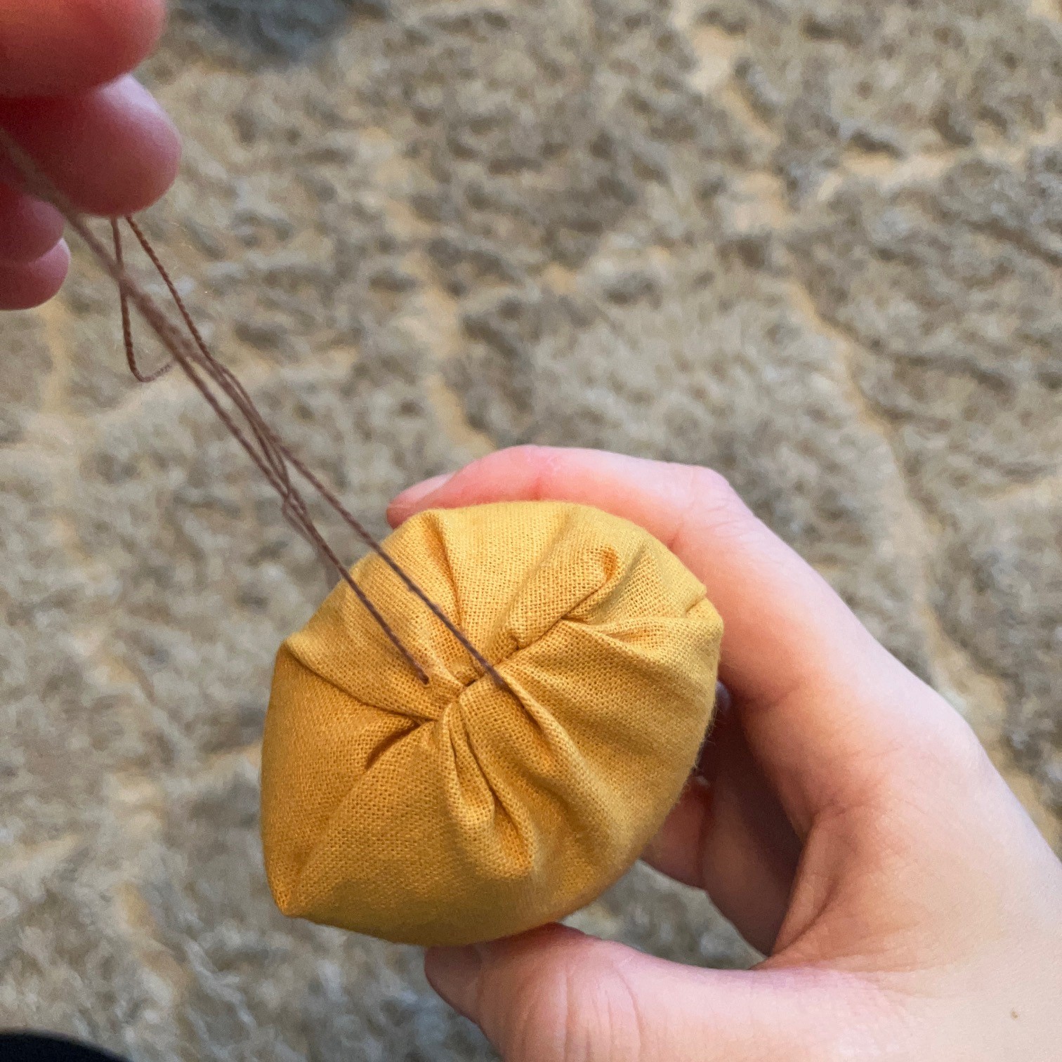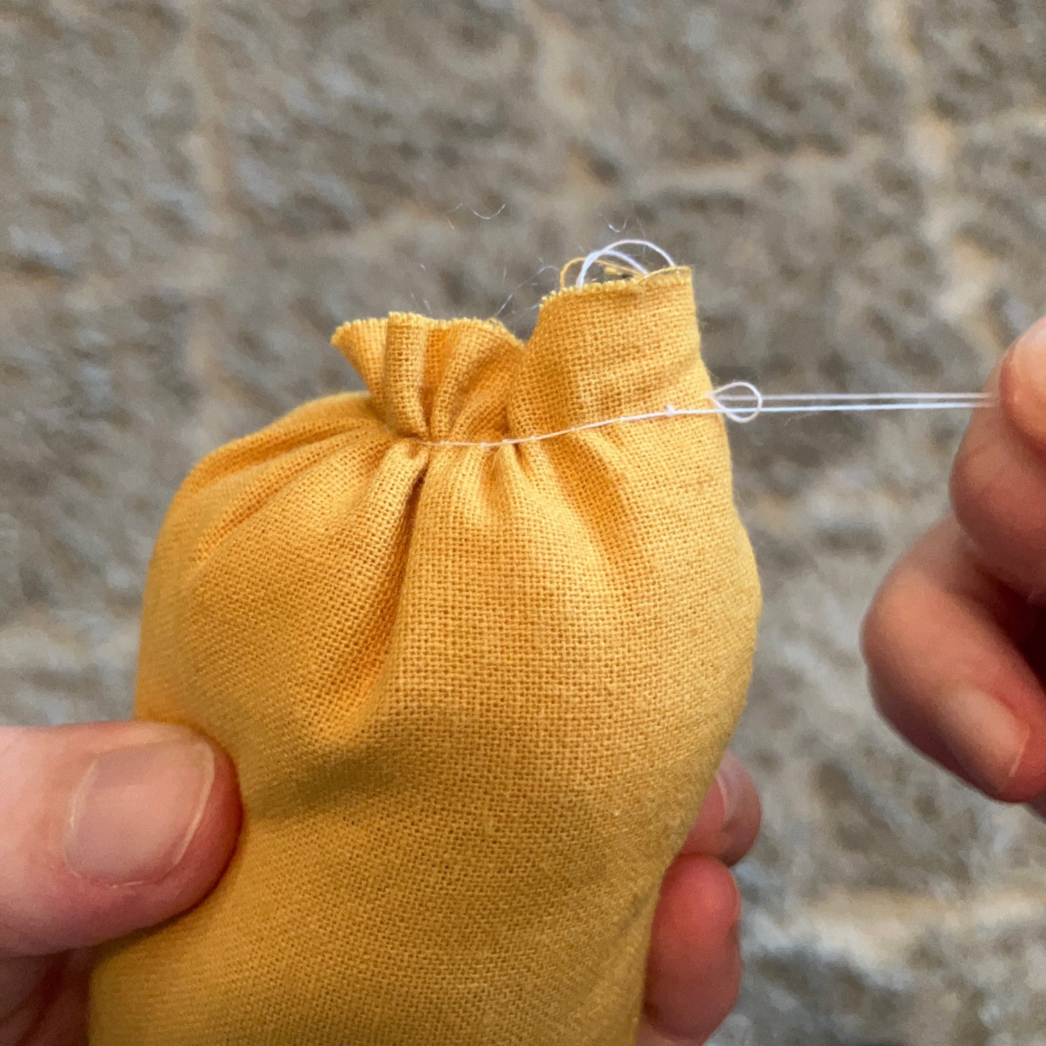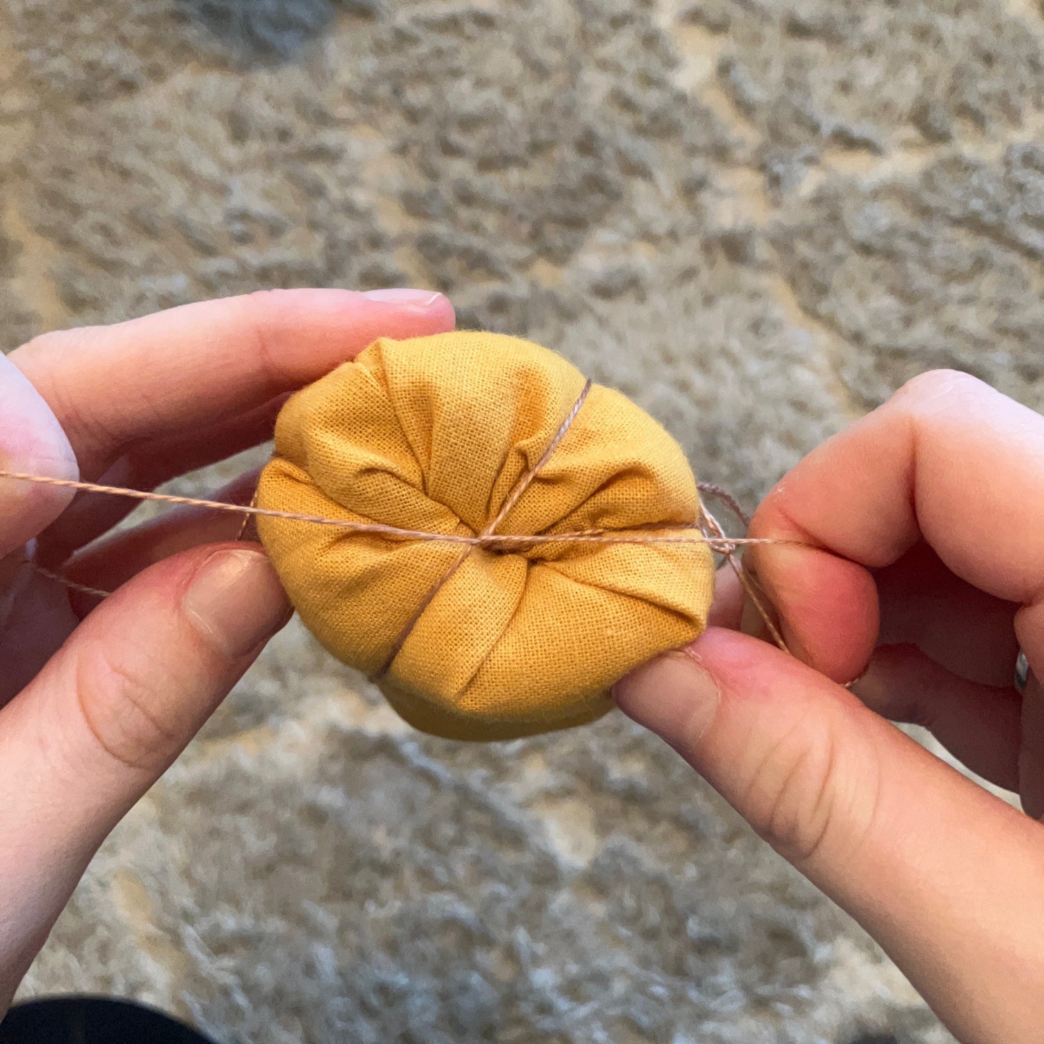 Pull the gathering stitches at the top of the pumpkin. Once gathered, knot the remaining threads to secure and cut close to knot. This will later be disguised by the stalk.