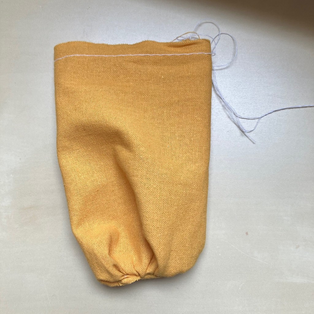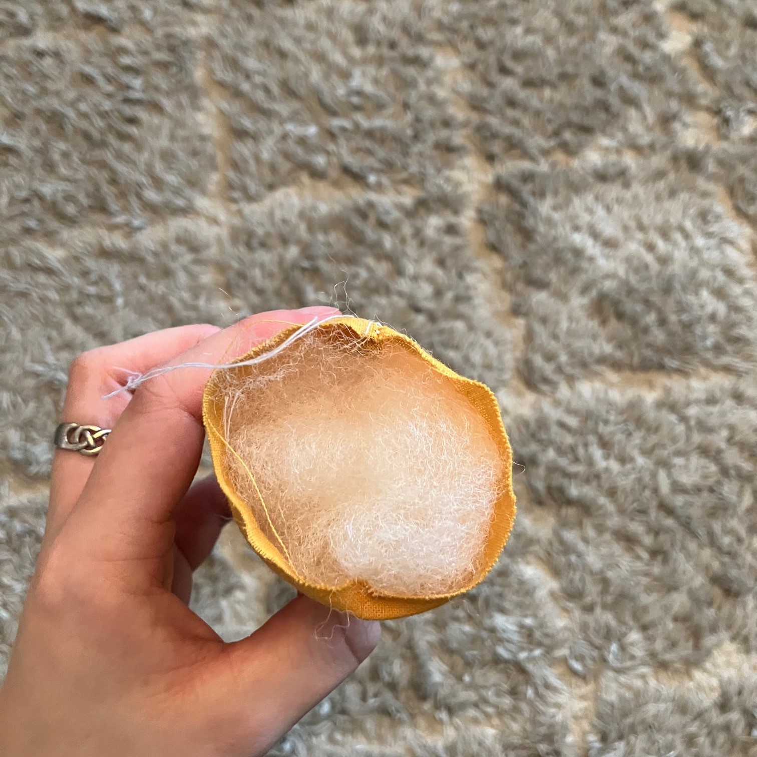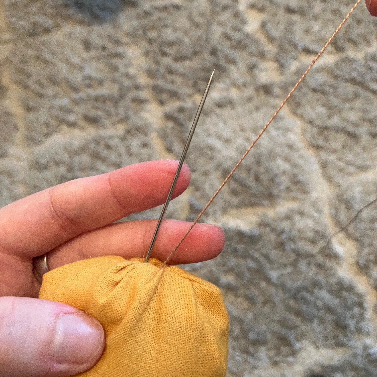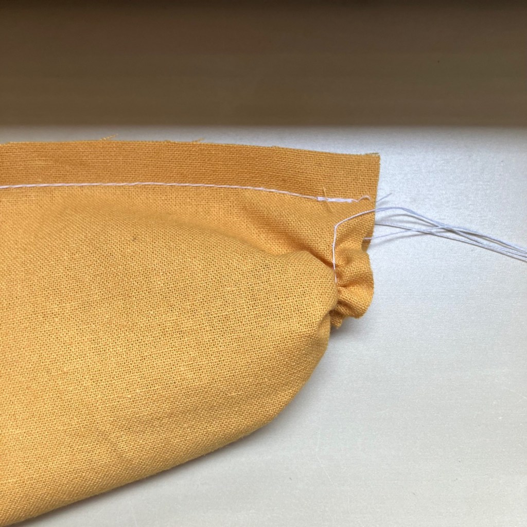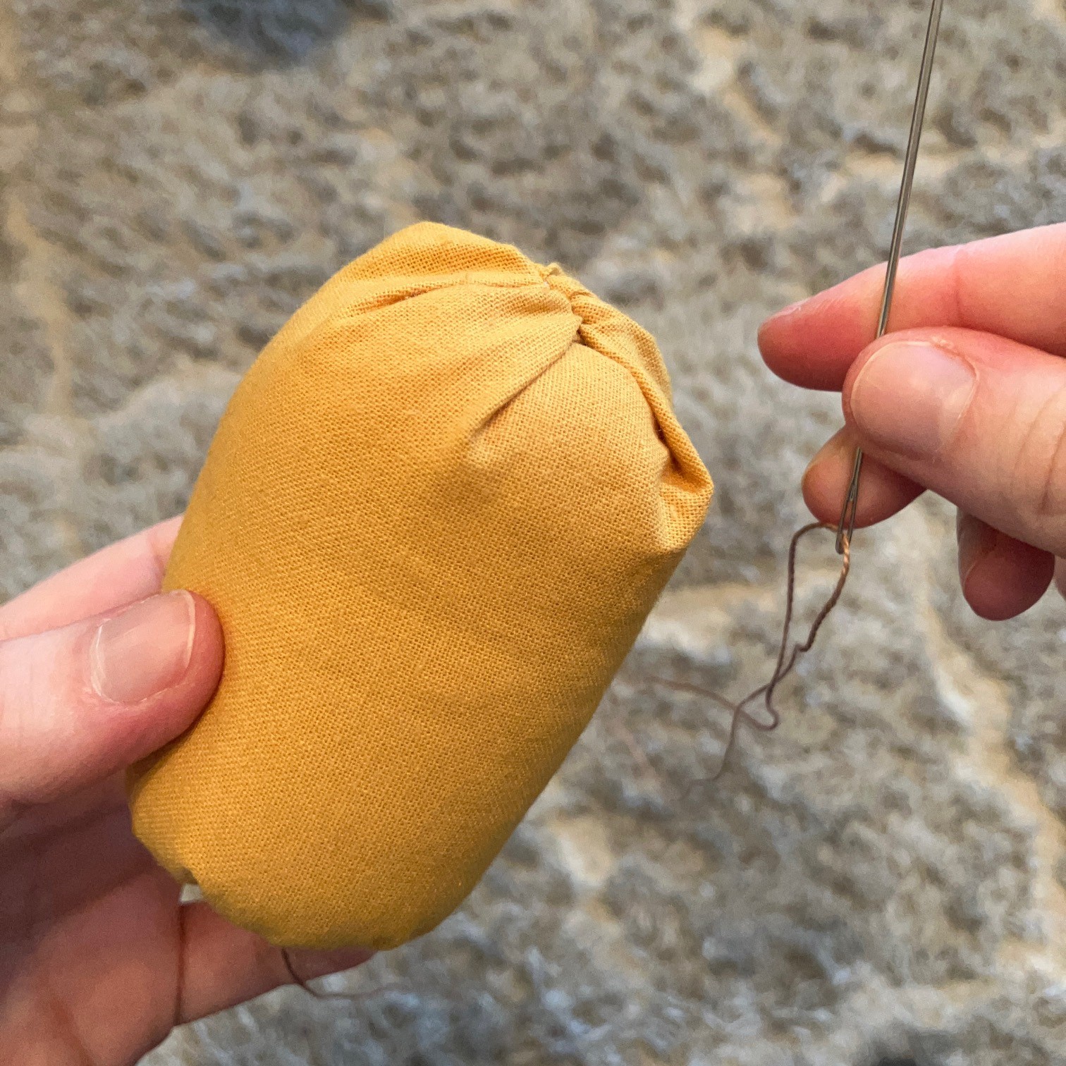 Pull the gathering stitches at the top of the pumpkin. Once gathered, knot the remaining threads to secure and cut close to knot. This will later be disguised by the stalk.