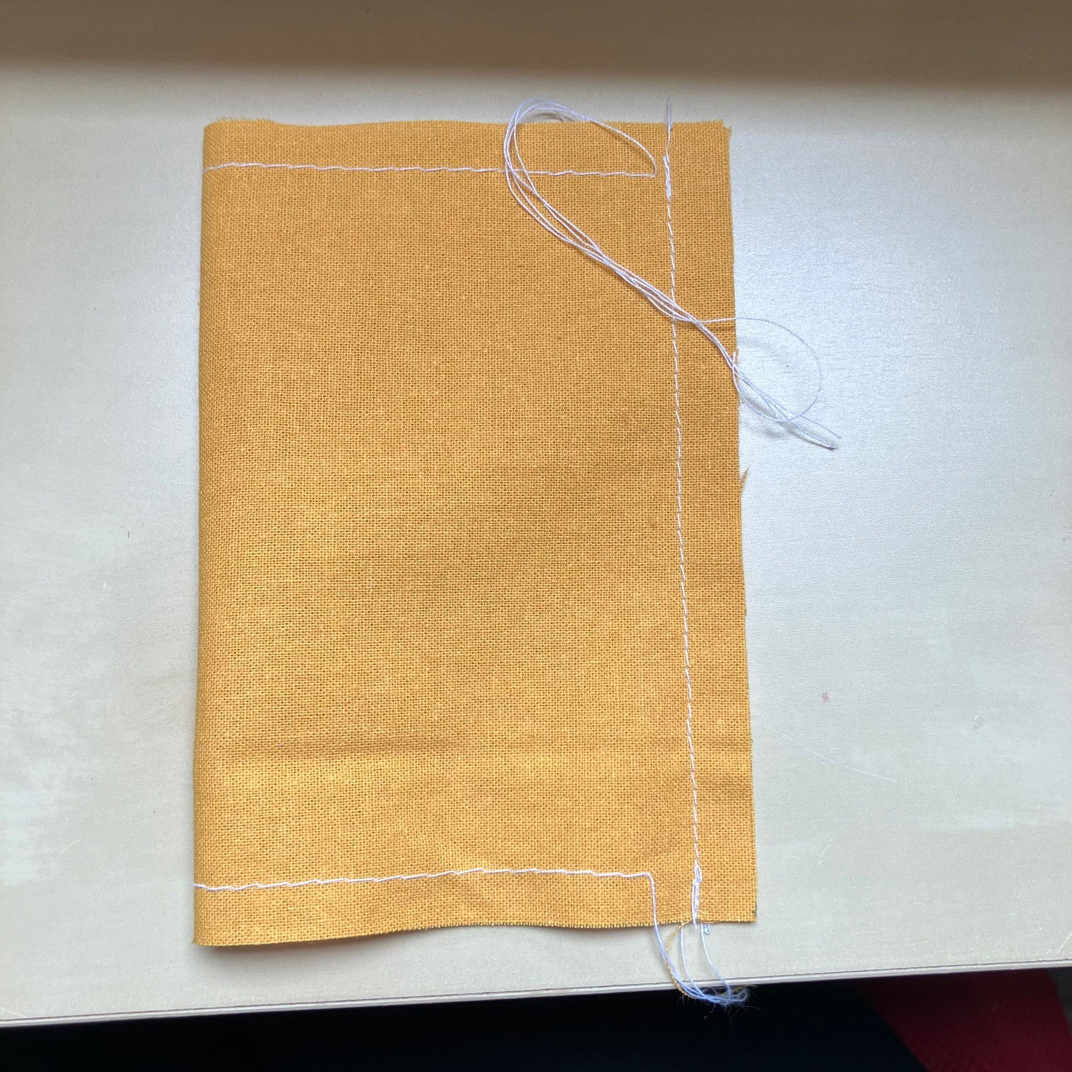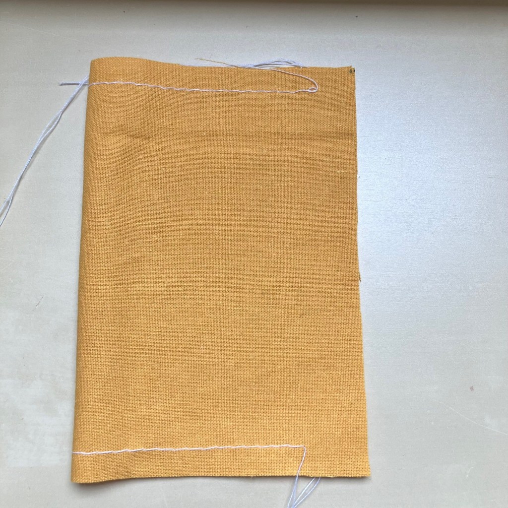 Sewing within 0.5cm from the edge, sew along both of the long sides. Leave start and end tails long. Do not back tack or fasten off.