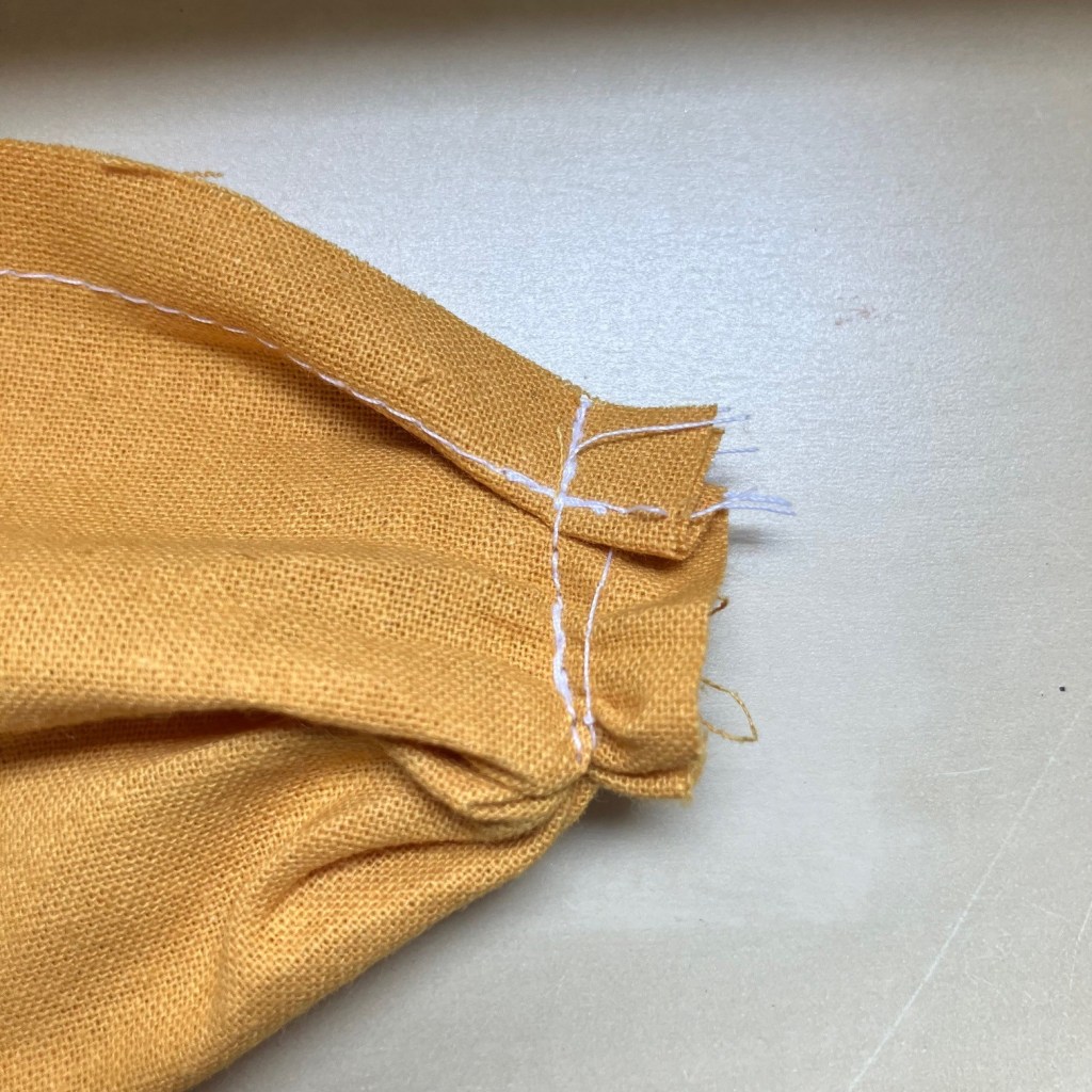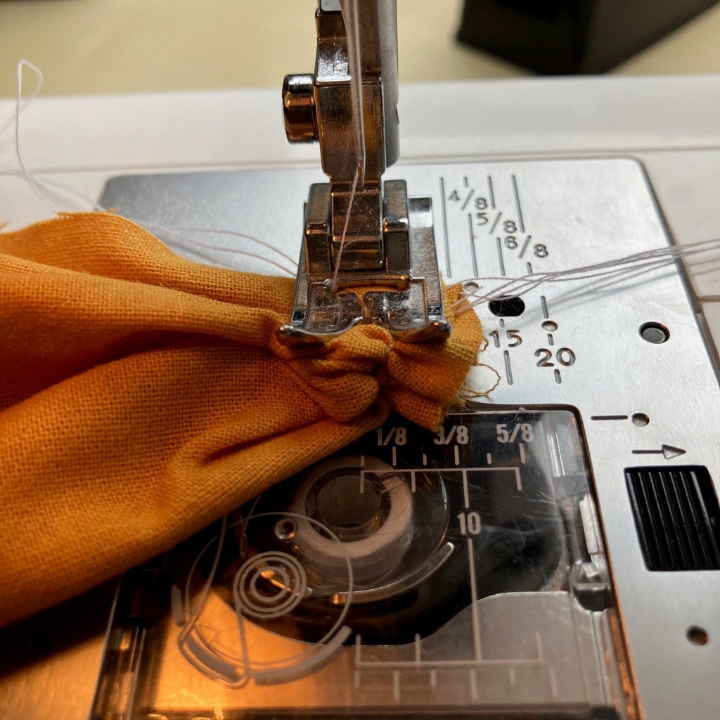 Place gathered end under sewing machine foot and sew across (or hand sew across securely).