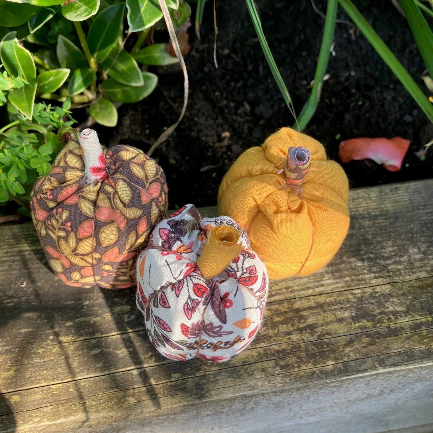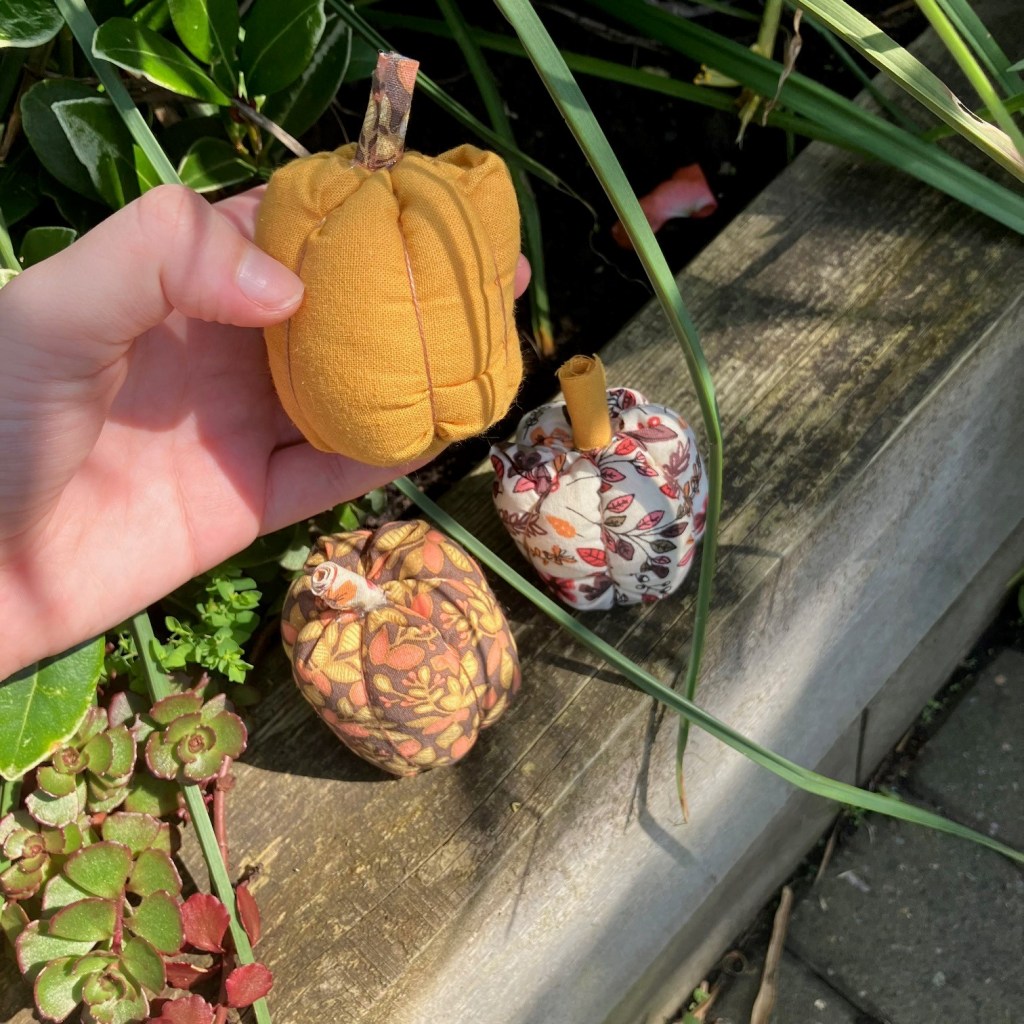 This was actually my mum’s idea to make little pumpkins and hide them around the UK on our travels. I came up with this speedy fabric version to make as many or as few as you like. They make great last minute gifts also.