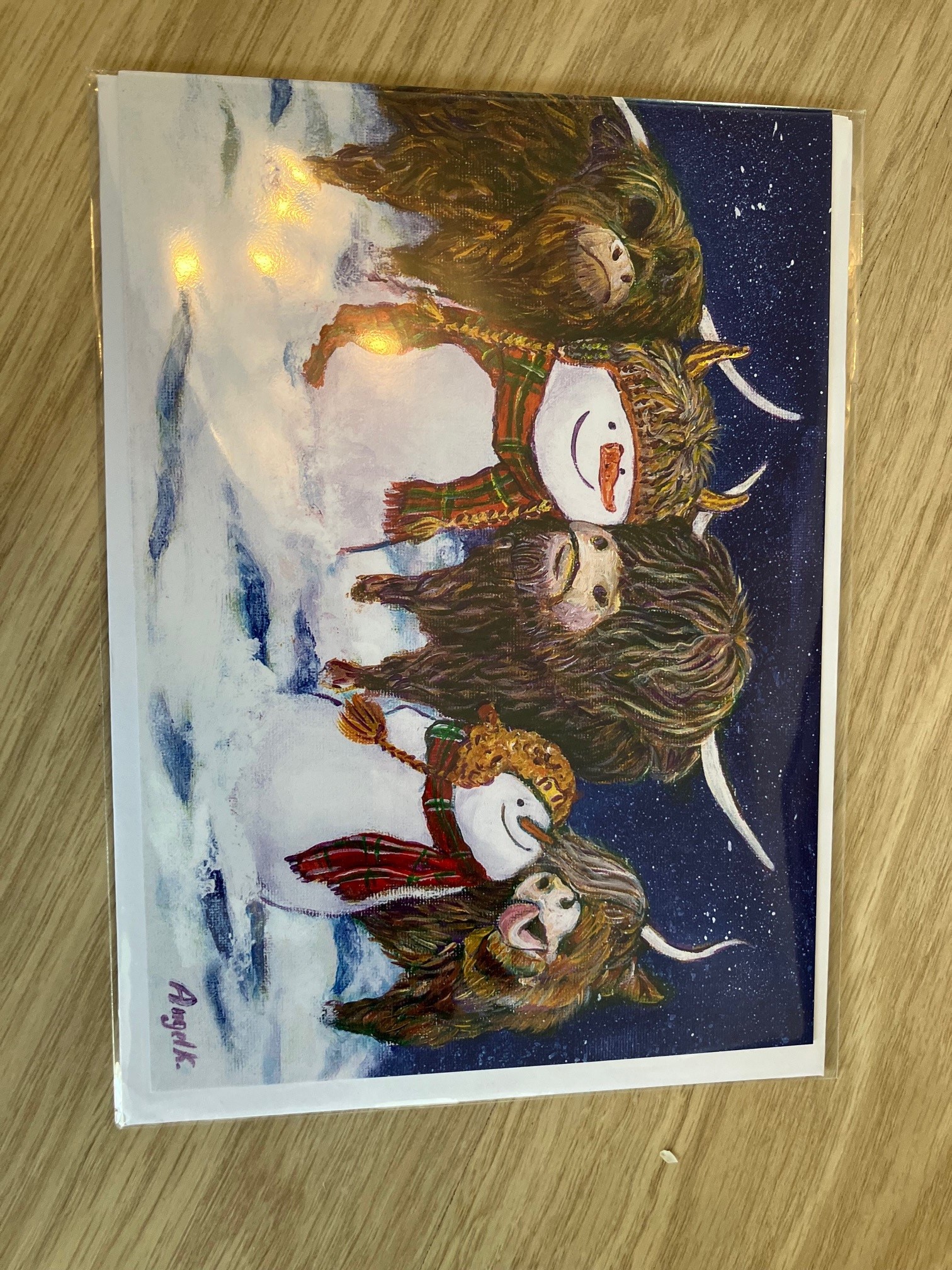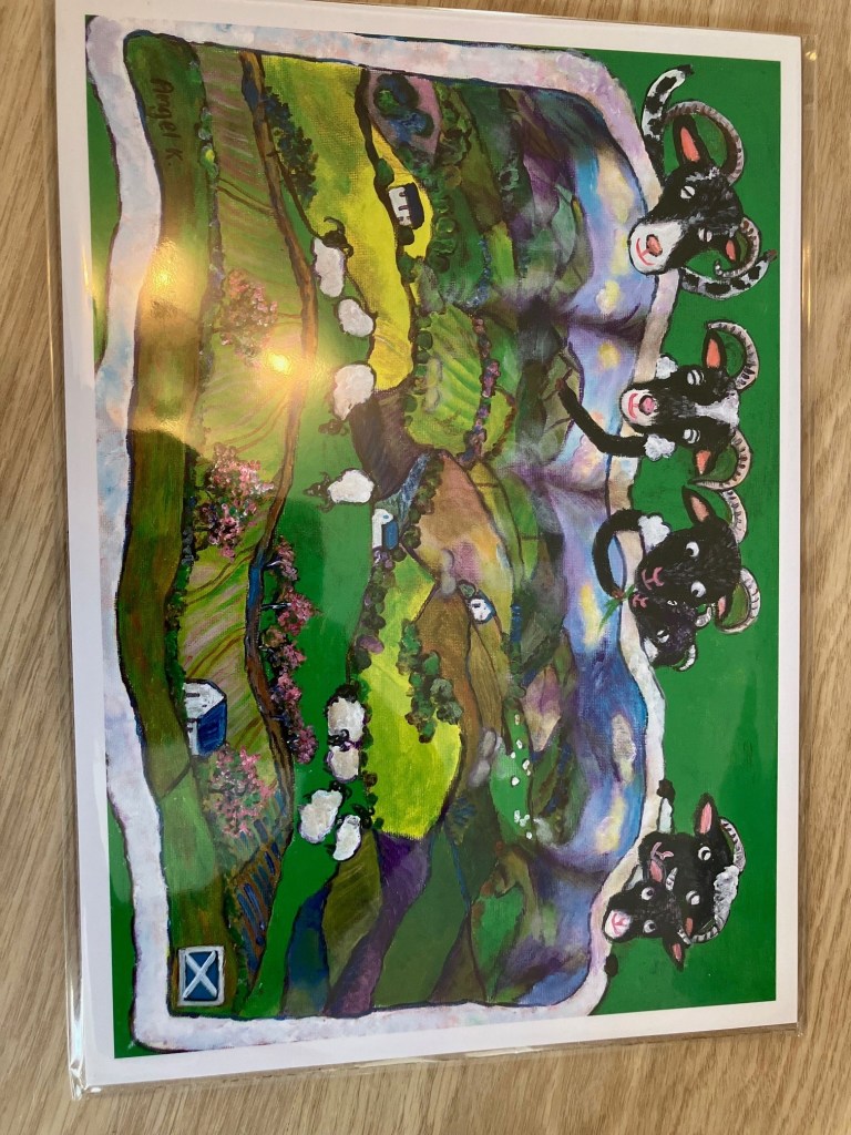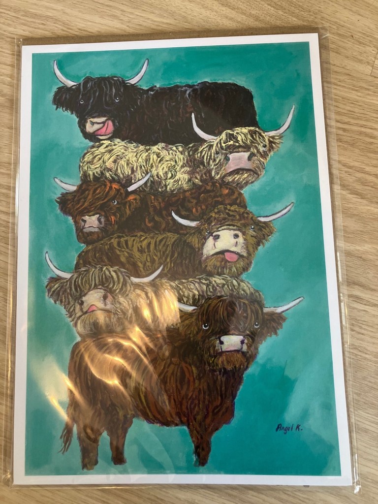 I then twirled around the greeting card stand and found the cutest print of Highland Coos at Christmastime. To my delight I also spotted this design as an A4 print and then I spotted another coo design, and then a sheep one. The prints were £15 each or 2 for £25.
