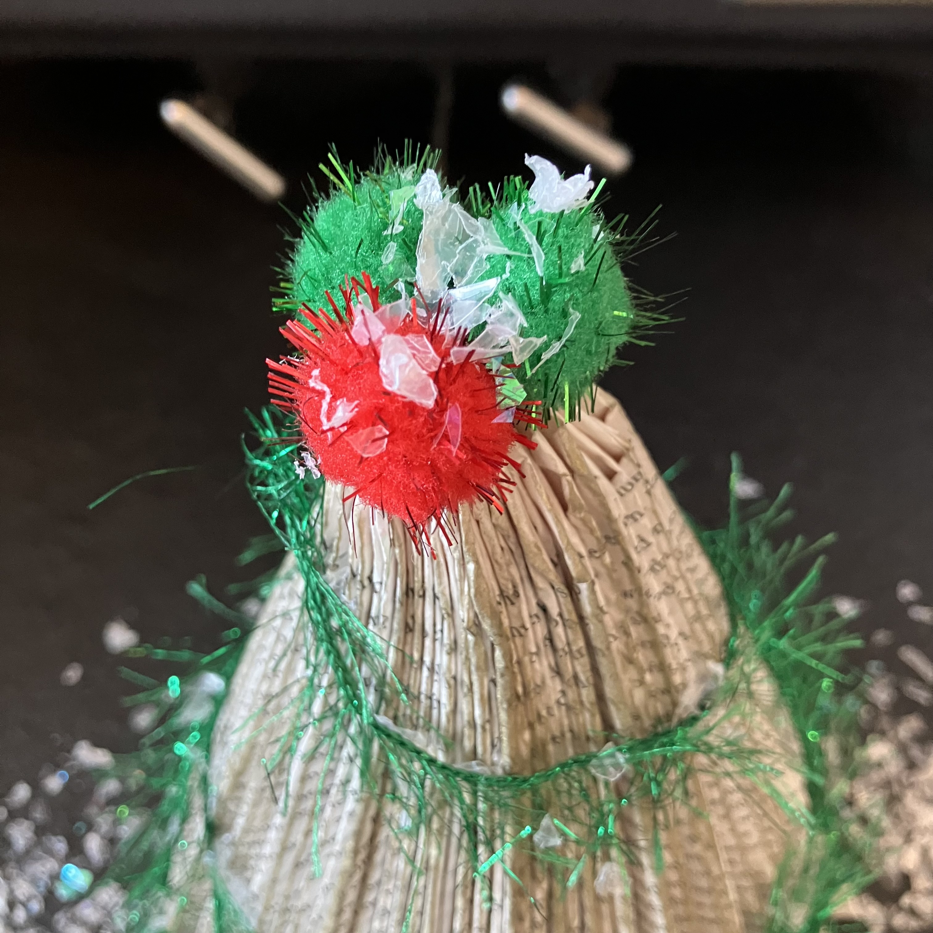 - Embellishments. We used tinsel yarn, pom poms and an ink pad. The ink pad was rubbed along the outer creases (see below).
