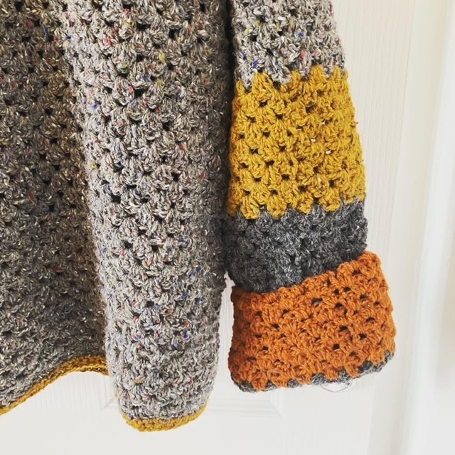 This jumper was very wool-hungry jumper to crochet. I used left over yellow, orange and grey on the sleeves. You know what – it doesn’t look half bad! With a bit of careful planning, I was able to make it look intentional by adding a row of yellow to hem of the main body.