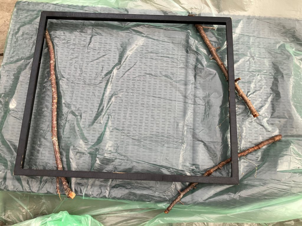 - Final prep is to raise the frames from your protective surface. This is because the spray paint will stick and when you remove, the protective surface will be stuck to the frame (especially paper). I raised my frames with sticks placed diagonally at the corners.